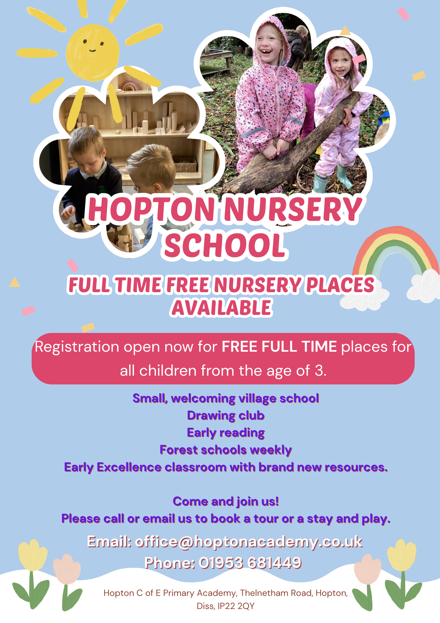 At Hopton C of E Primary Academy, we welcome children from the term after their third birthday and have nursery places which are funded. As a school, we will top up the funding to 30 hours to offer free places to your child if your child attends our setting for the first 15 hours funded, We are dedicated to fostering a nurturing and stimulating environment for our youngest learners. The EYFS framework is uniquely designed to support your child’s early learning and development, laying the foundational skills necessary for their future educational journey. Our committed staff prioritises a balanced approach that combines play, exploration, and structured learning, ensuring that each child can thrive according to their individual needs and interests.